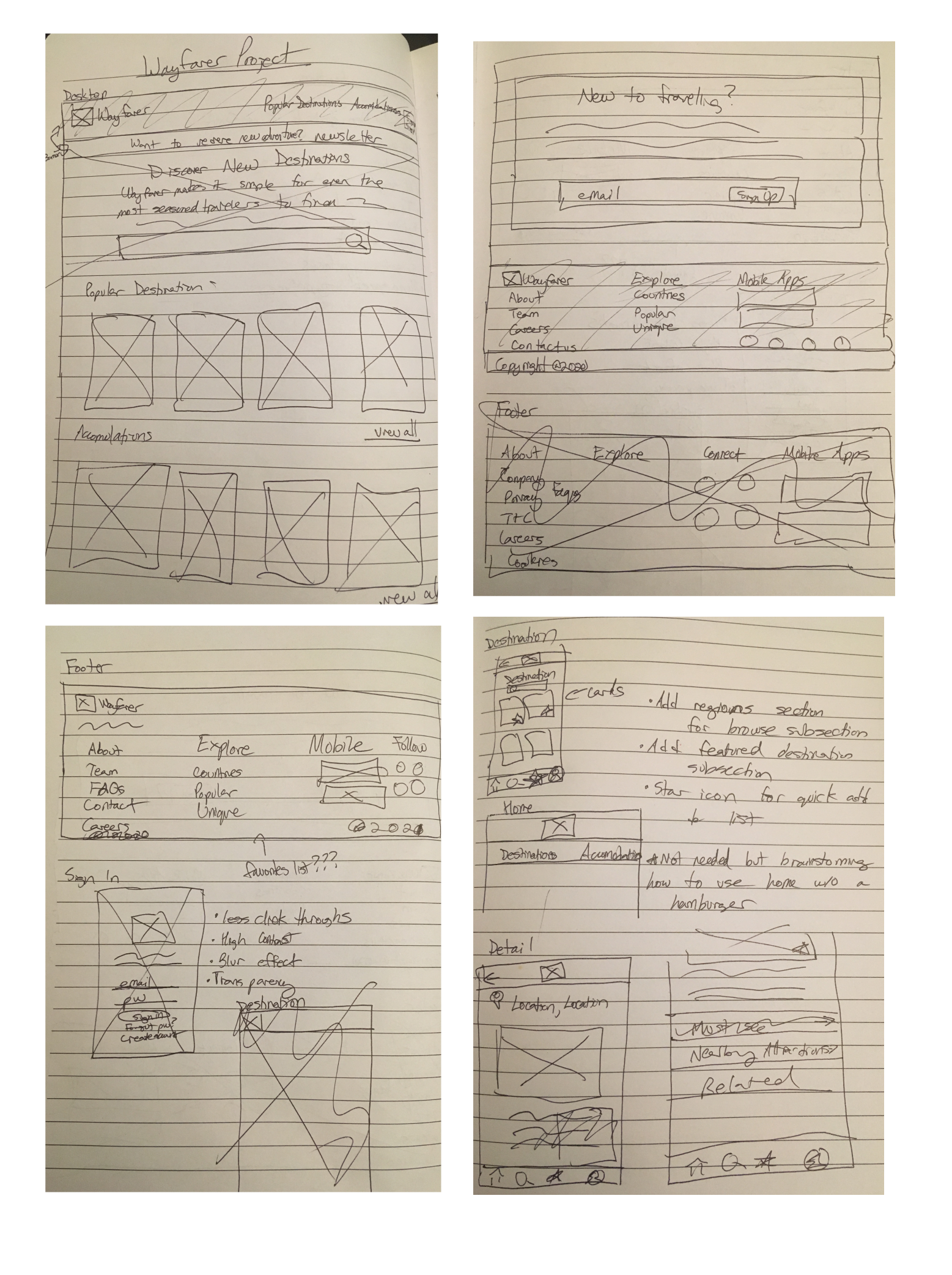 I used my discoveries from my market research to sketch out potential solutions for Wayfarer's home screen on desktop, as well as screens for the mobile app. This task took approximately an hour and a half.